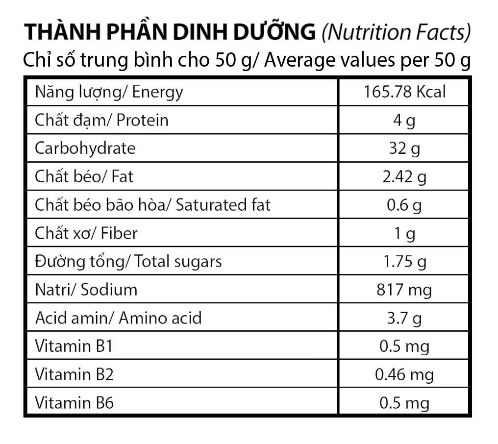 - Gói gia vị dinh dưỡng: Muối, đường, chiết xuất nấm men (0.9 g/50 g), bột sườn heo (0.5 g/50 g), bột thịt gà (0.35 g/50 g), bột hành, bột tỏi, bột xì dầu, bột tiêu, hành lá sấy, các vitamin (B1, B2, B6), chất xơ.