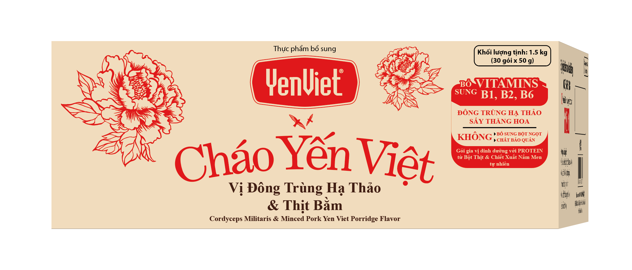 - Gói đông trùng hạ thảo: Thịt sấy (thịt heo, thịt gà), đạm đậu nành, cà rốt sấy thăng hoa, nấm tuyết sấy thăng hoa, đông trùng hạ thảo sấy thăng hoa (60 mg/50 g), tổ yến sấy thăng hoa (5 mg/50 g).