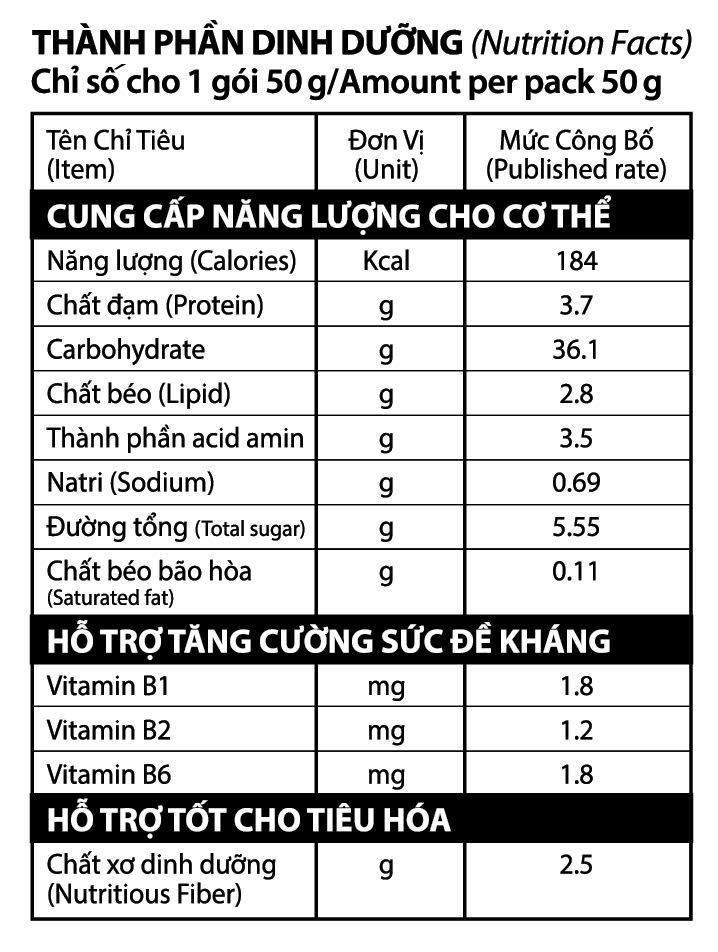 - Gói gia vị dinh dưỡng: Muối i-ốt, đường, chất chiết xuất nấm men (0.8 g/50 g), bột nấm đông cô (0.3 g/50 g), bột xì dầu, bột tiêu, ngò rí sấy, các vitamin (B1, B2, B6), chất xơ.