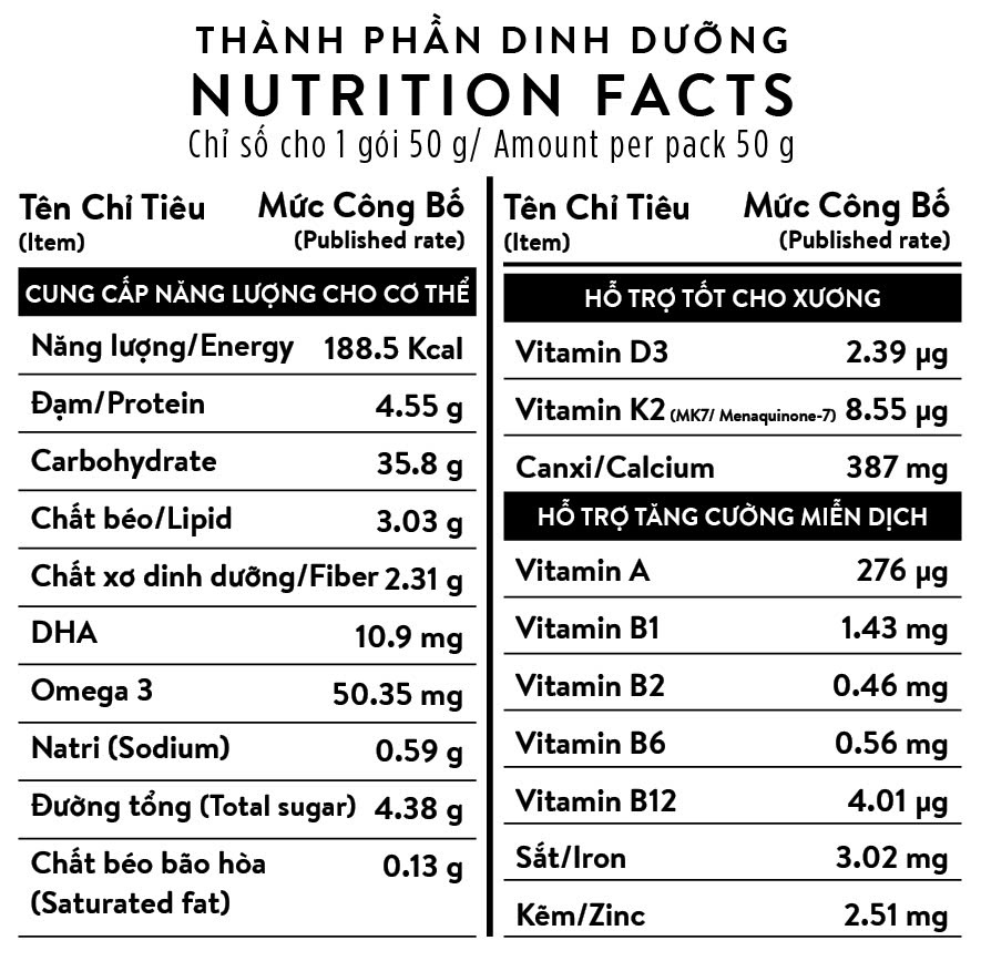- Gói gia vị dinh dưỡng: Bột sườn heo (2 g/50 g), muối I-ốt, đường, chiết xuất nấm men (0.8 g/50 g), bột thịt gà, bột hành, bột xì dầu, hành lá sấy, hỗn hợp các vitamin và khoáng chất (B1, B2, B6, B12, A, D3, K2, sắt, kẽm, canxi), chất xơ.
