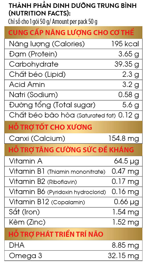 - Gói dinh dưỡng: Thịt bò sấy thăng hoa (0.5 g/50 g), đạm đậu nành, bó xôi sấy thăng hoa (0.35 g/50 g), nấm tuyết sấy thăng hoa, tổ yến sấy thăng hoa (50 mg/50 g).