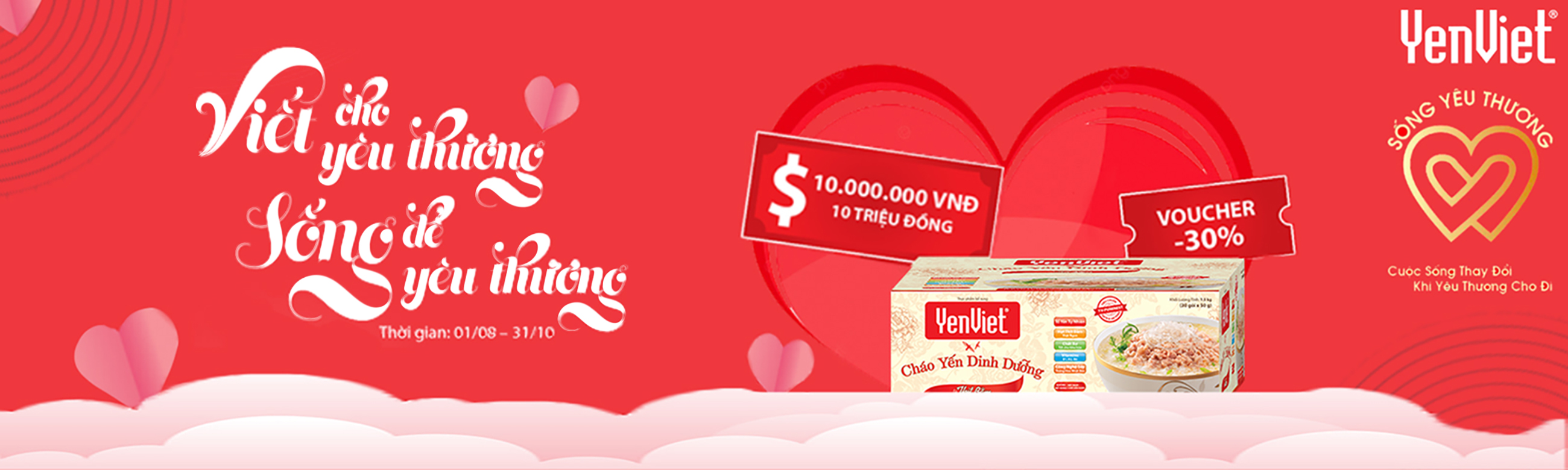 Với mong muốn truyền cảm hứng về một lối sống tích cực và tràn đầy tình yêu thương, Công ty Cổ phần Yến Việt (Yến Việt) tổ chức cuộc thi “Viết để yêu thương”. Bên cạnh những giải thưởng hấp dẫn trị giá lên đến chục triệu đồng, cuộc thi còn là cơ hội để bạn dễ dàng bày tỏ tình cảm với mọi người, từ đó giúp các mối quan hệ xung quanh trở nên gắn kết và gần gũi hơn. Tham gia ngay để rinh về những giải thưởng hấp dẫn với giá trị giải thưởng lên đến 10 triệu đồng.