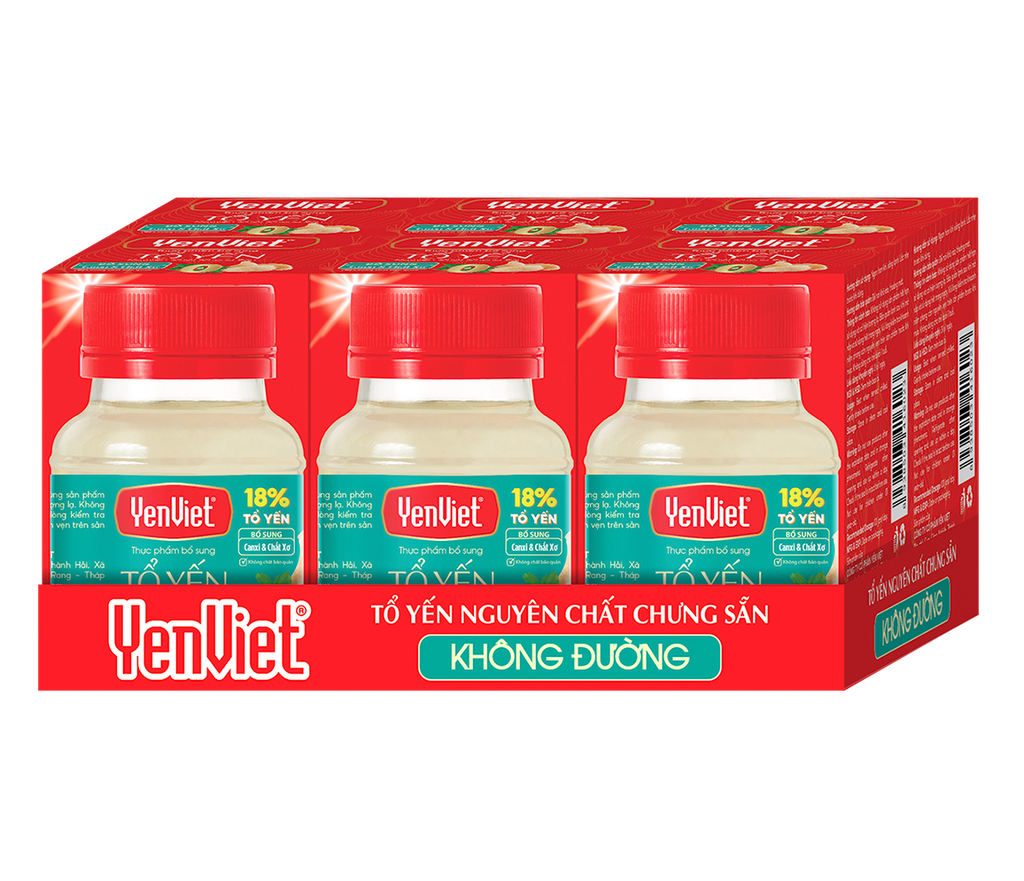 THÀNH PHẦN: Nước, tổ yến (18%), chất xơ, canxi lactate, chất làm dày (INS 406, INS 953), chất ổn định (INS 401, INS 407), chất tạo ngọt tự nhiên (chiết xuất từ cây cỏ ngọt INS 960a), hương liệu tổng hợp (hương yến).