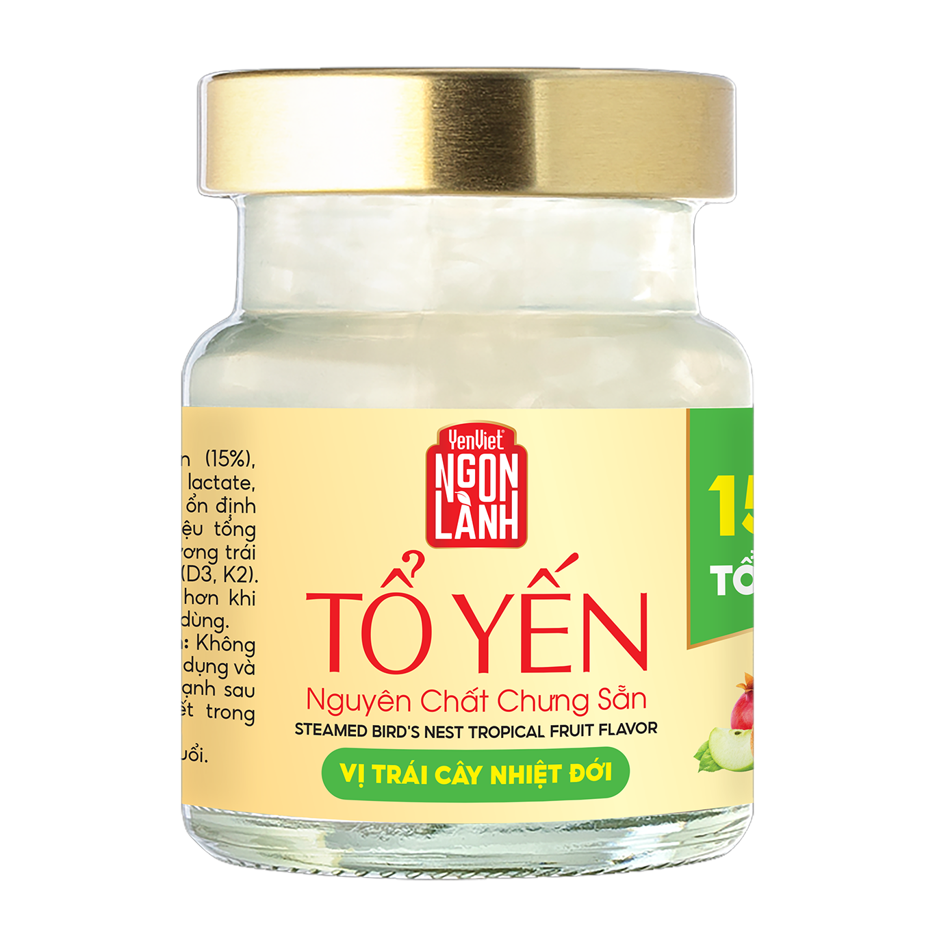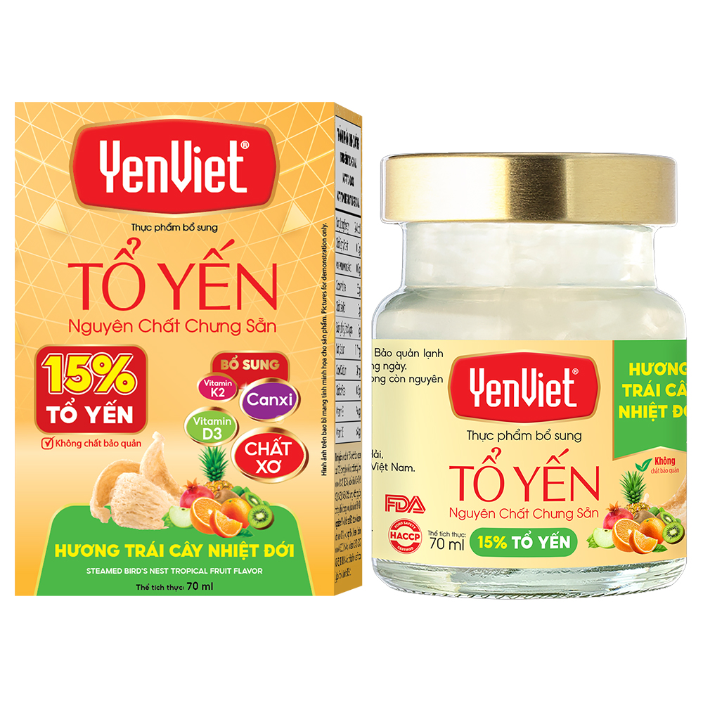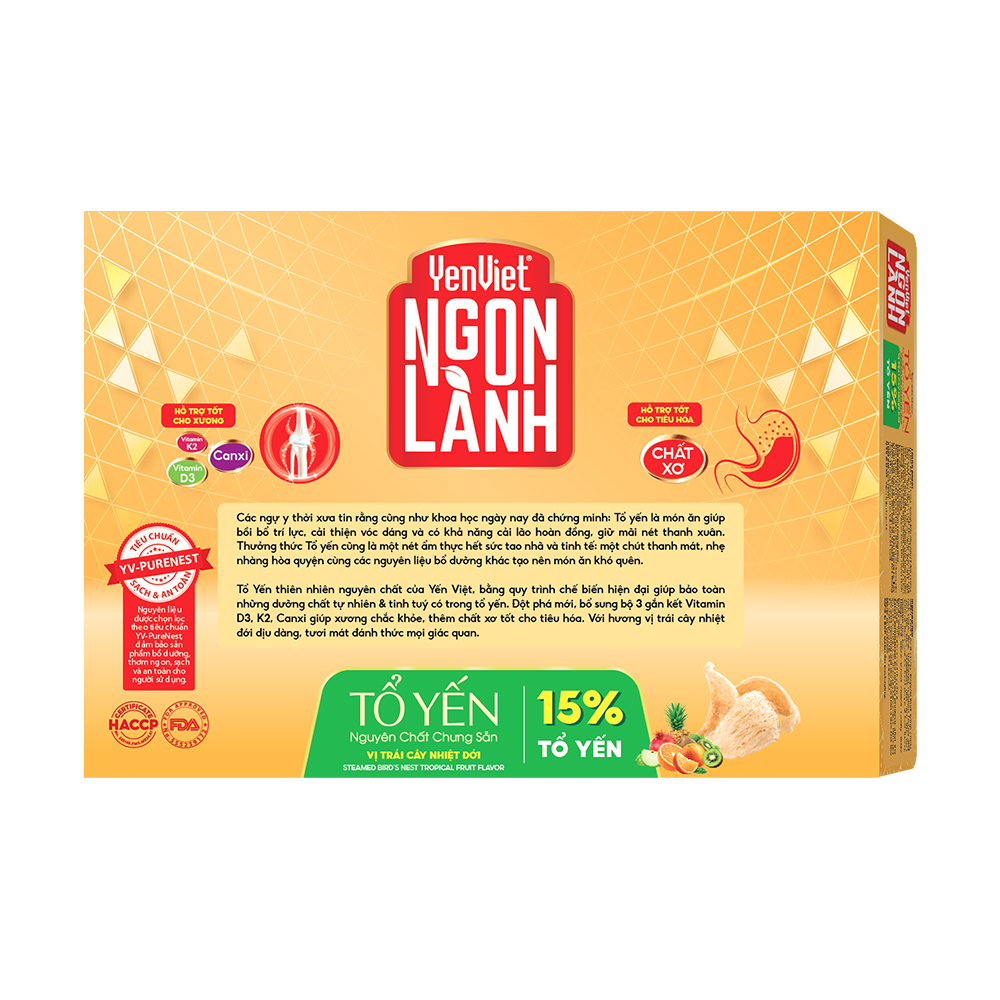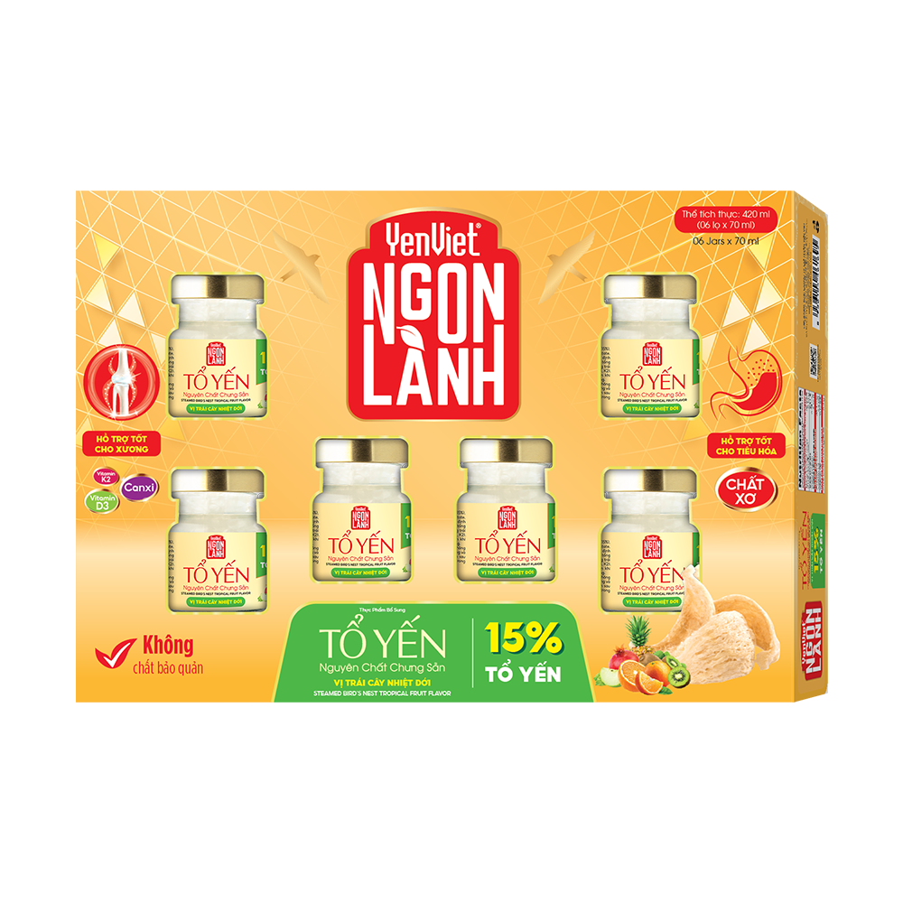 THÀNH PHẦN: Nước, tổ yến (15%), syrup trái cây nhiệt đới (10%), đường phèn, chất xơ, chất làm dày (canxi lactate (INS 327), INS 406), chất ổn định (INS 401, INS 407), hương liệu tổng hợp dùng cho thực phẩm (hương trái cây nhiệt đới), nhóm vitamin (D3, K2).